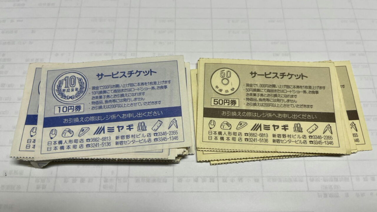 独り言 雑文2025-07-04。 zem 2025年7月4日 2月からの改修工事で館内の家具備品は全て撤去、ついでに事務所も大整理しました。写真はその時に出て来たサービス券、昔懐かしい紙媒体。母親が貯めてたんですが、亡くなったのが6年前、その前の10年間は施設だったので、少なくとも15年以上は前の物。で、興味本位、900円分あったので、ダメ元で使えるか聞いてみたら断れました。昭和の名残、まだ父が貯めてた銀座博品館のサービス券も1200円分あります、使えるか今度試してみます。