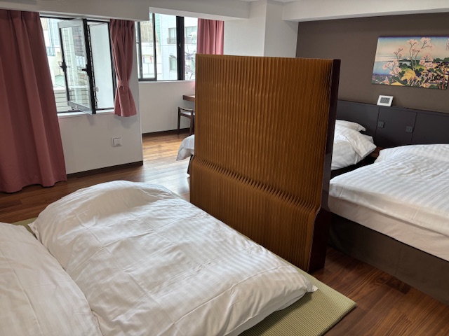 来週ご予約のお得意様から家族の生活時間がバラバラなんで、パーティションが欲しいとリクエストを頂きました。畳に布団、通常のパーテーションだと下に隙間があるので、灯りが漏れて寝ずらいかなと思い、ネットでいろいろ探して見つけたのが写真の製品です。まずは試しに1台購入、今回の滞在でまずは使って頂いて感想を伺おうと思います。